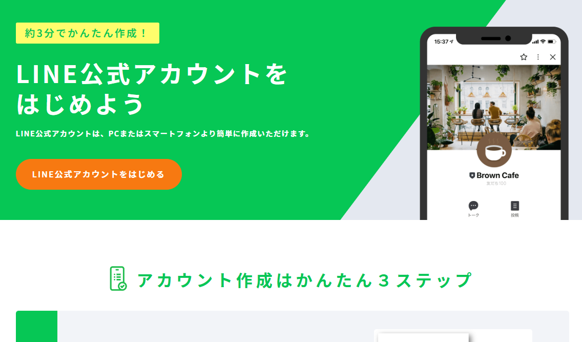 LINE公式アカウントの公式ページにアクセスし「LINE公式アカウントをはじめる」ボタンをクリック